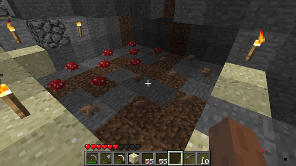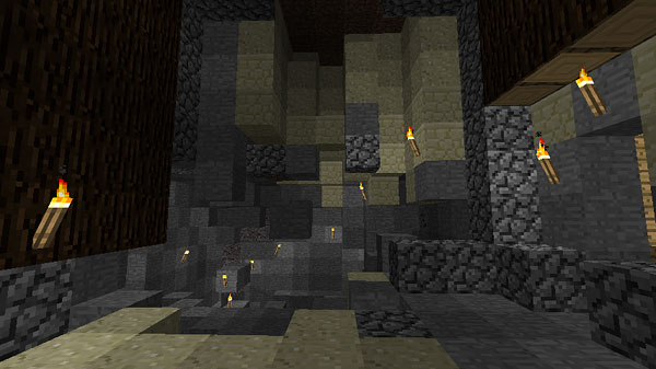 次に地下を坑道と同じく掘り進みます。計測が正しければ先ほどマーキングした丸石にぶち当たります。そこで曲がり、次の丸石を目指すわけです。