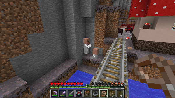 スクリーンショットは以前、マイクラの日常で紹介した、3つスポーンブロックがある部屋だったはずが2つしか無かったというスポーン部屋です。実はここはキノコバイオームの地下にありました。