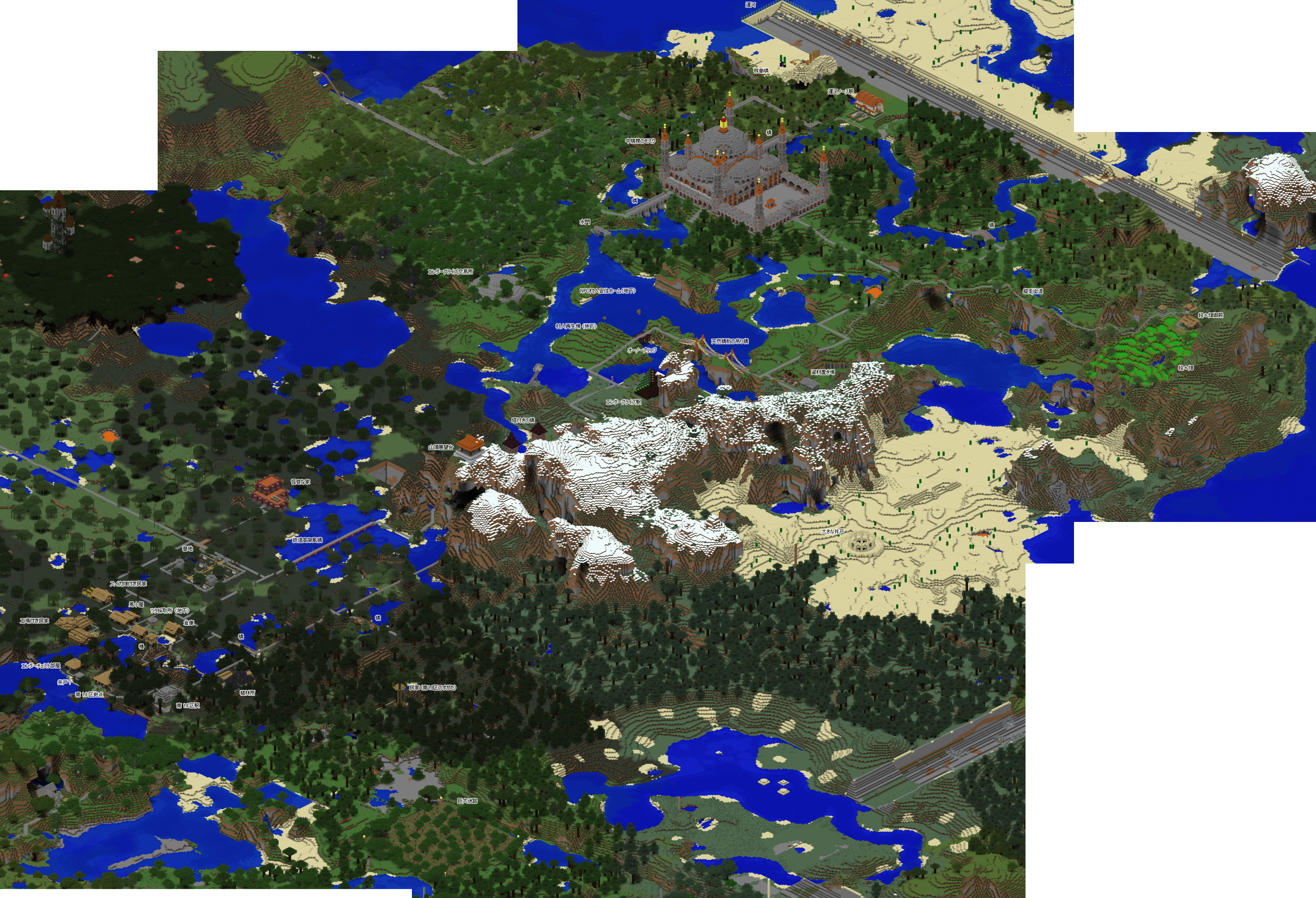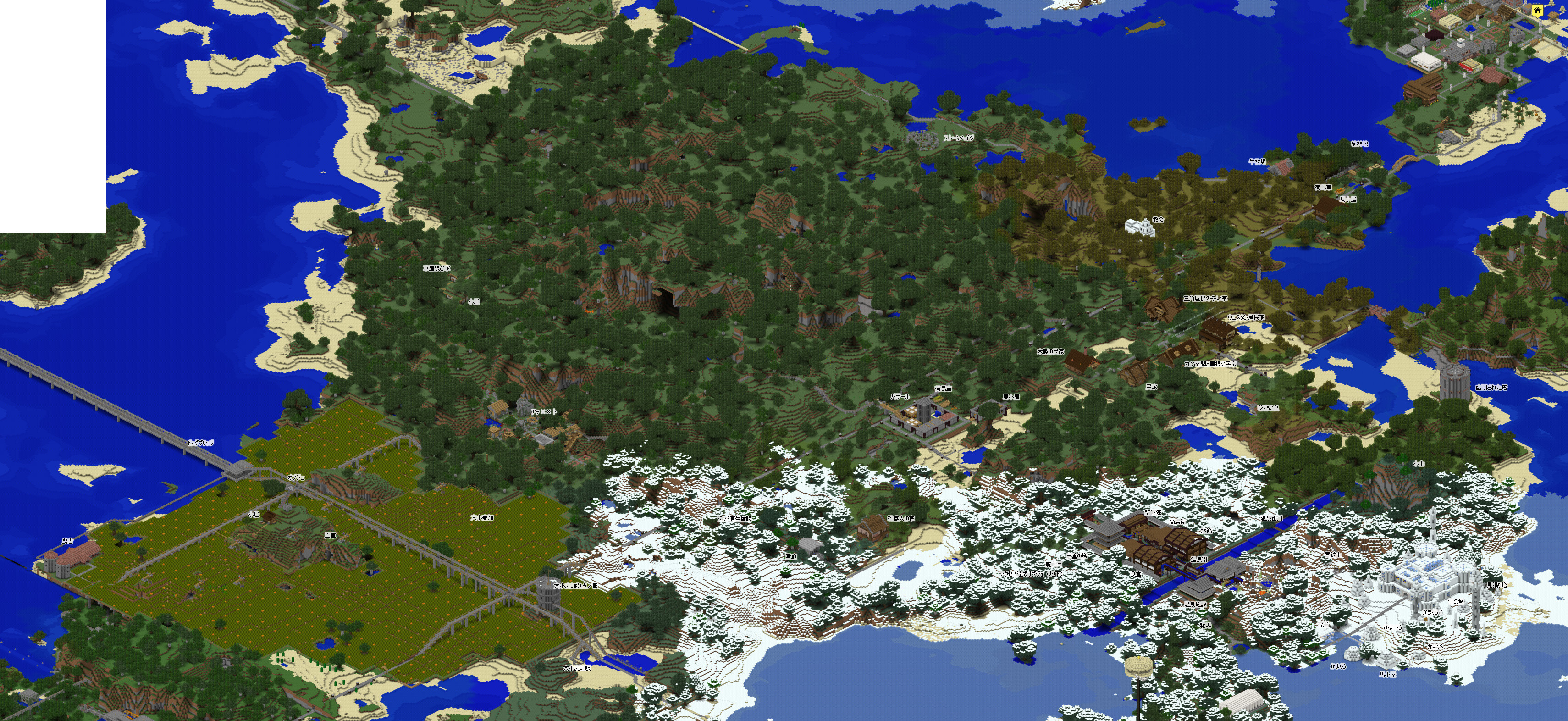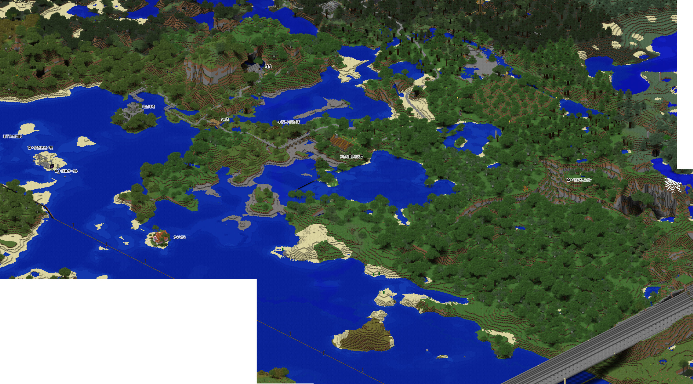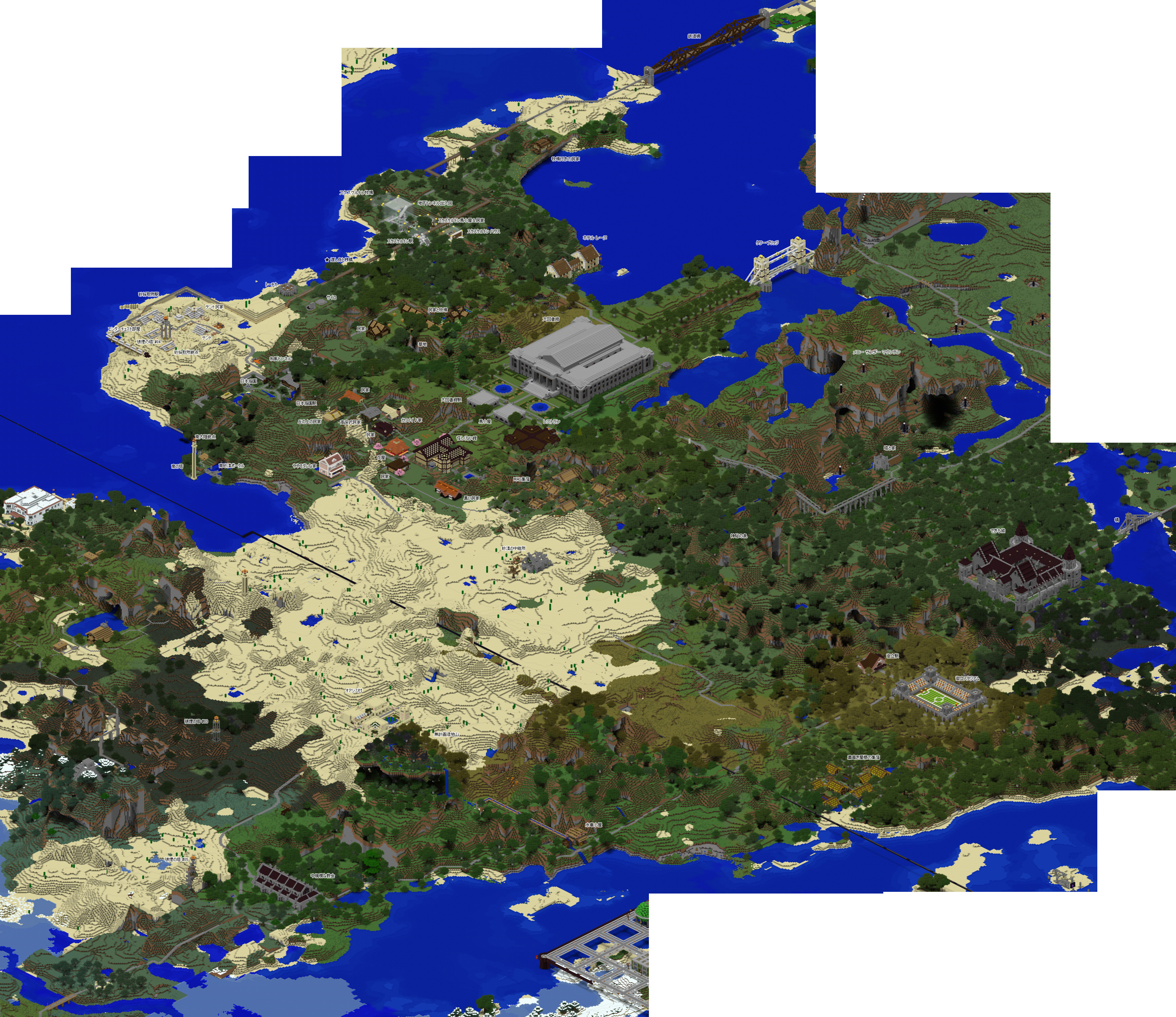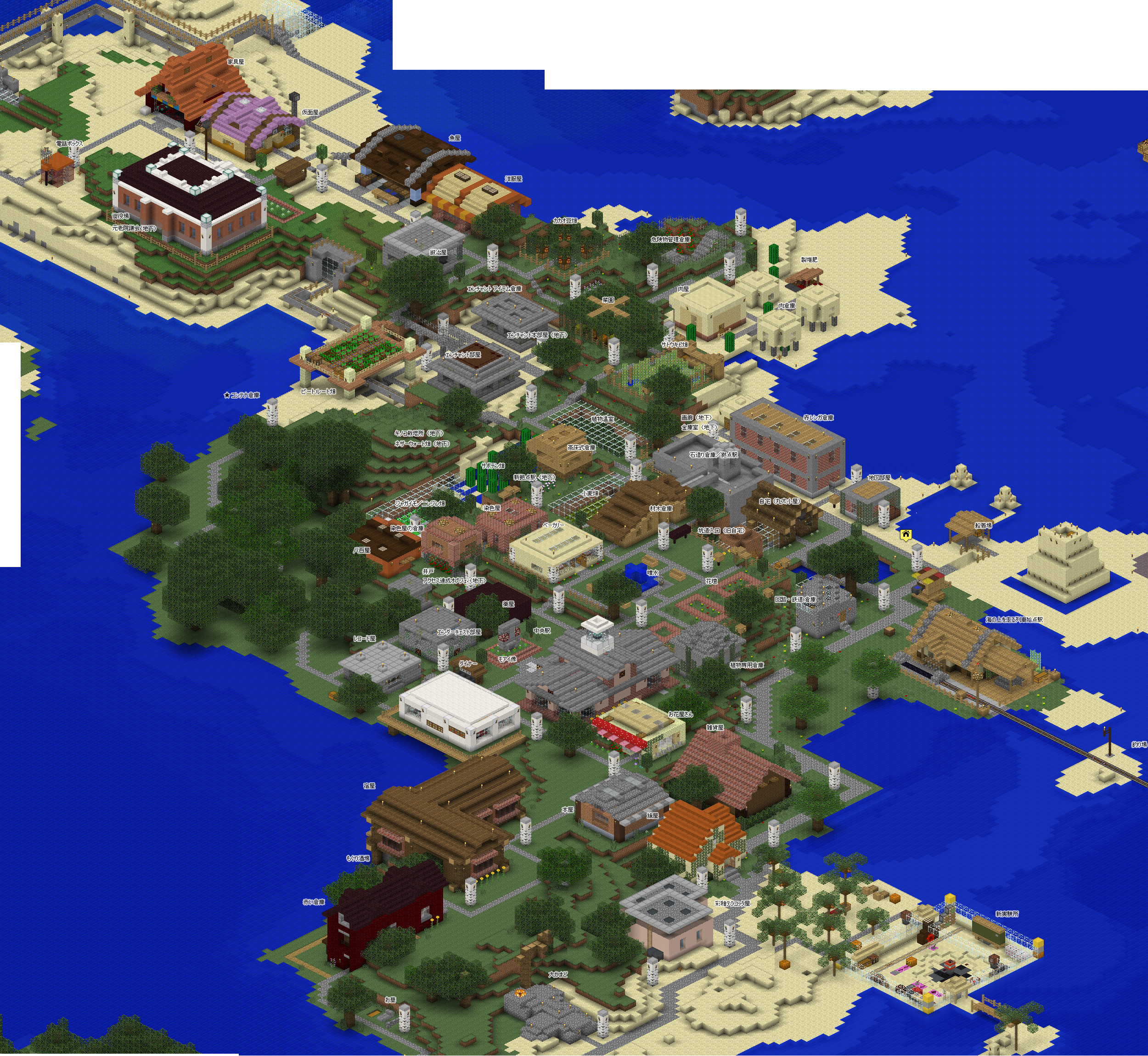 今回もグーグルマップ風の鳥瞰地図を作成したのですが、これを作成するソフトがまだ Minecraft 1.13 には未対応なので、1.12の最後のバックアップ セーブデータをレンダリングしています。その為、一部の建造物等は反映されておりませんが、予めご了承くださいませ。