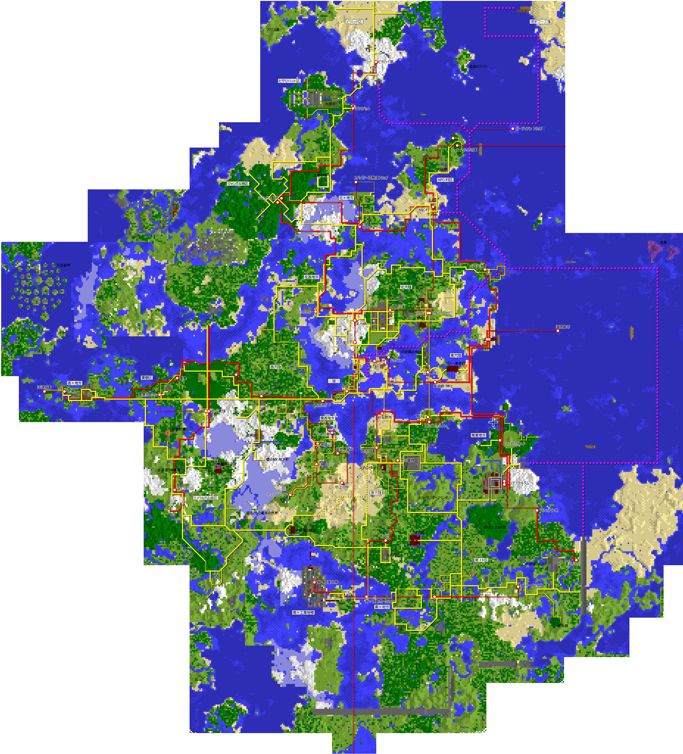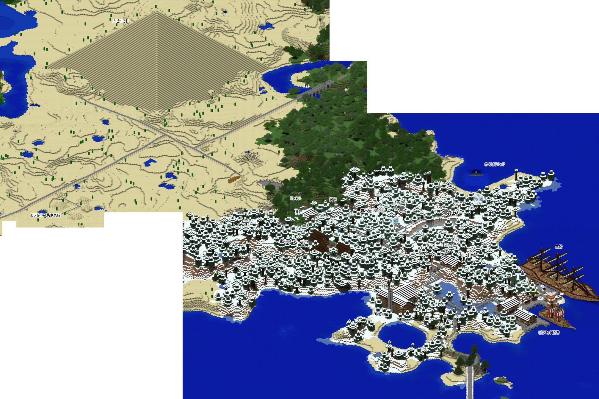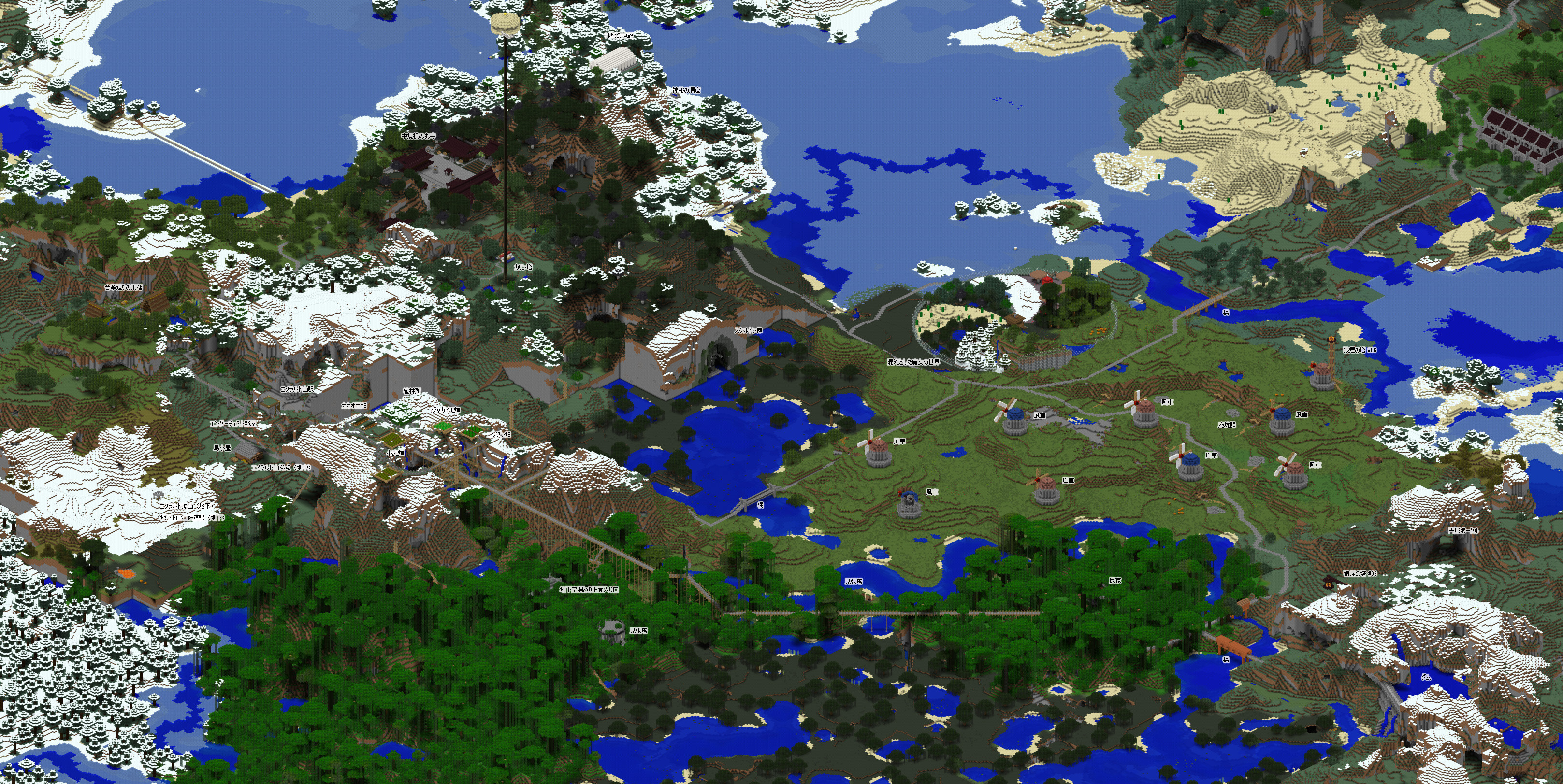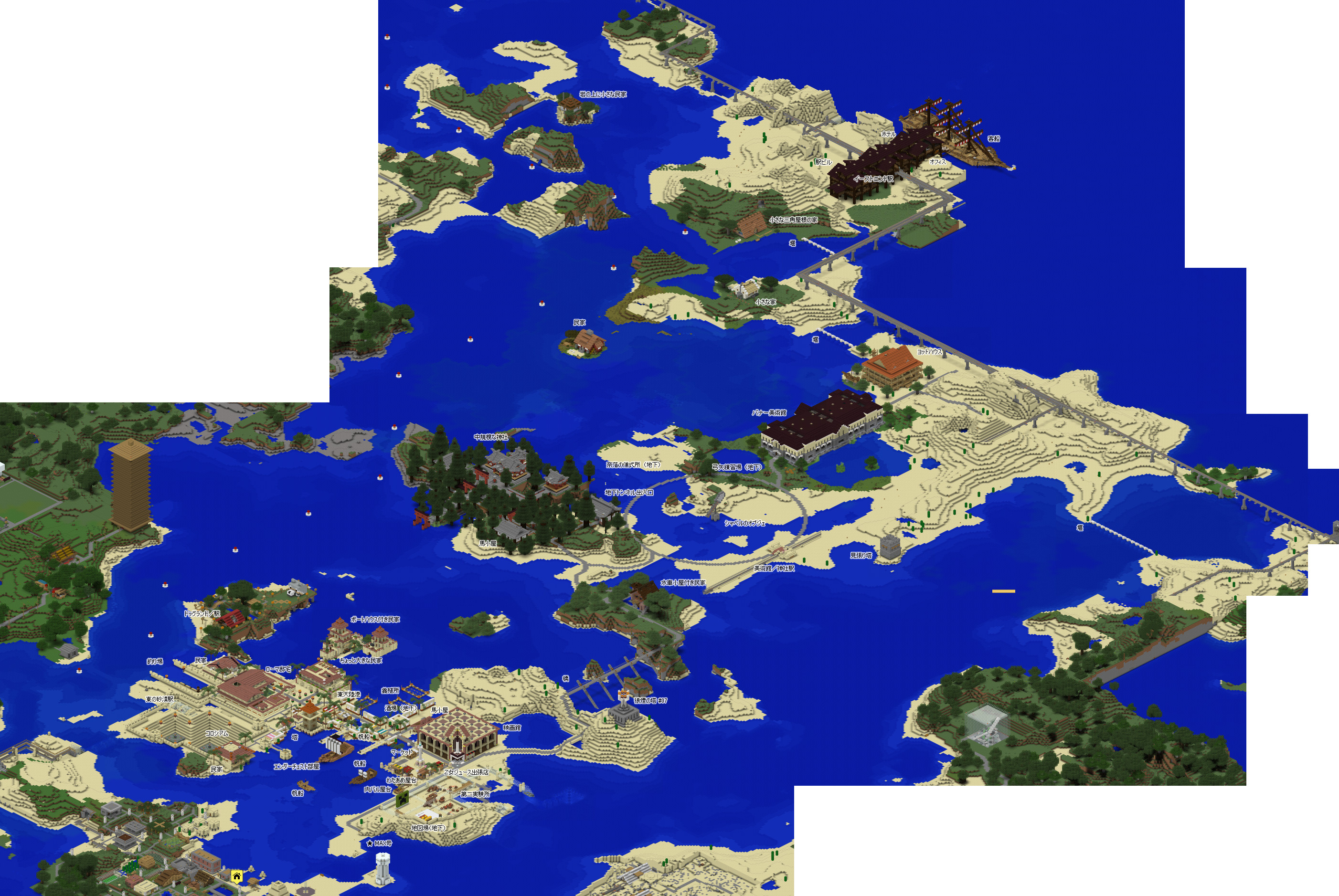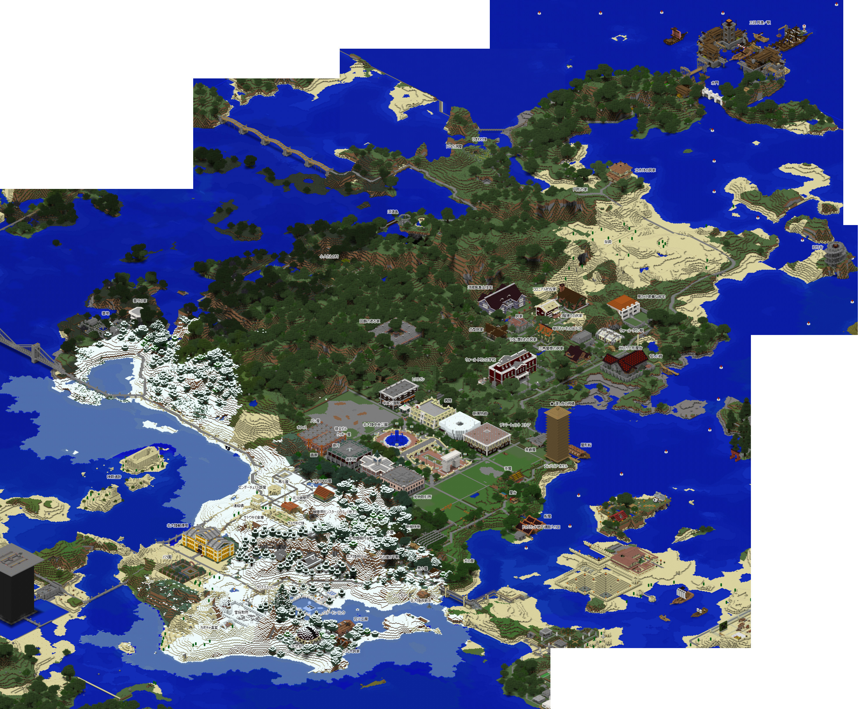 今回もグーグルマップ風の鳥瞰地図を作成したのですが、これを作成するソフトがまだ Minecraft 1.13 には未対応なので、1.12の最後のバックアップ セーブデータをレンダリングしています。その為、一部の建造物等は反映されておりませんが、予めご了承くださいませ。